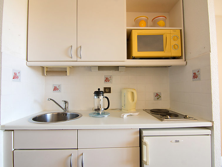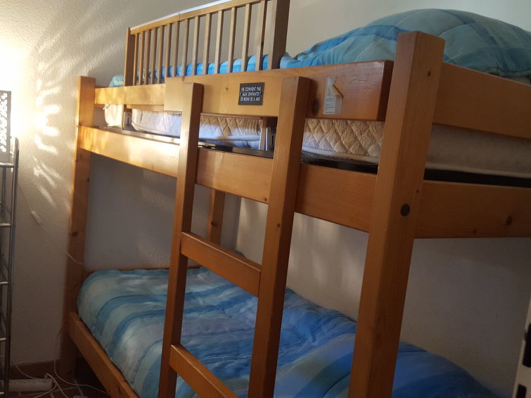 Appartement 2-kamers 40 m2 op de 1e verdieping. Eenvoudig ingericht: woonkamer met panoramavenster met TV (Flatscreen TV), DVD en ventilator. Uitgang naar het terras. Cabine, zonder kast met 1 x 2 stapelbedden (80 cm, lengte 190 cm), ventilator. 1 kamer met 1 2-pers bed (1 x 140 cm, lengte 190 cm), ventilator. Kookhoek (2 inductiekookplaten, broodrooster, waterkoker, magnetron, elektrische koffiemachine). Douche, aparte WC. Elektrische verwarming. Terras 5 m2, overdekt. Terrasmeubelen, ligstoelen (2). Beperkt uitzicht op zee. Ter beschikking: wasmachine, strijkijzer, haardroger. Internet (Internet (WiFi), extra). Parkeerplaats nr. A151/472. 1 klein huisdier/hond toegestaan. TV alleen FR. Rookmelders. In plaats van een afgesloten slaapkamer bevinden sommige slaapgedeeltes zich in een open ruimte (galerij, nis, etc.). 83107000216J5