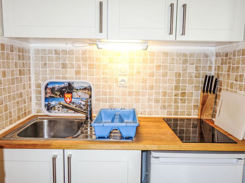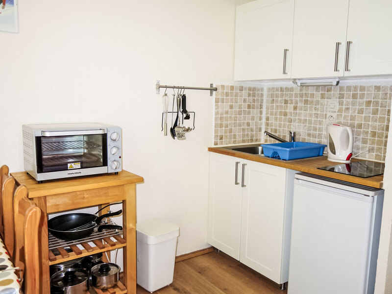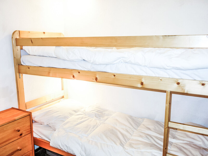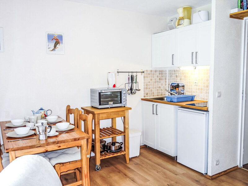 Studio 1-kamer 23 m2 op de 2e verdieping. Woon-/eetkamer met 1 2-pers divanbed en TV. Uitgang naar het balkon. Slaapnis met 1 x 2 stapelbedden. Kookhoek (2-pits kookplaat, oven, broodrooster, waterkoker, elektrische koffiemachine). Badkamer, aparte WC. Elektrische verwarming. Klein balkon 3 m2, op het zuiden gelegen. Uitzicht op de bergen. Ter beschikking: Internet (WiFi, extra). Rookmelders. In plaats van een afgesloten slaapkamer bevinden sommige slaapgedeeltes zich in een open ruimte (galerij, nis, etc.). 74085000469WS